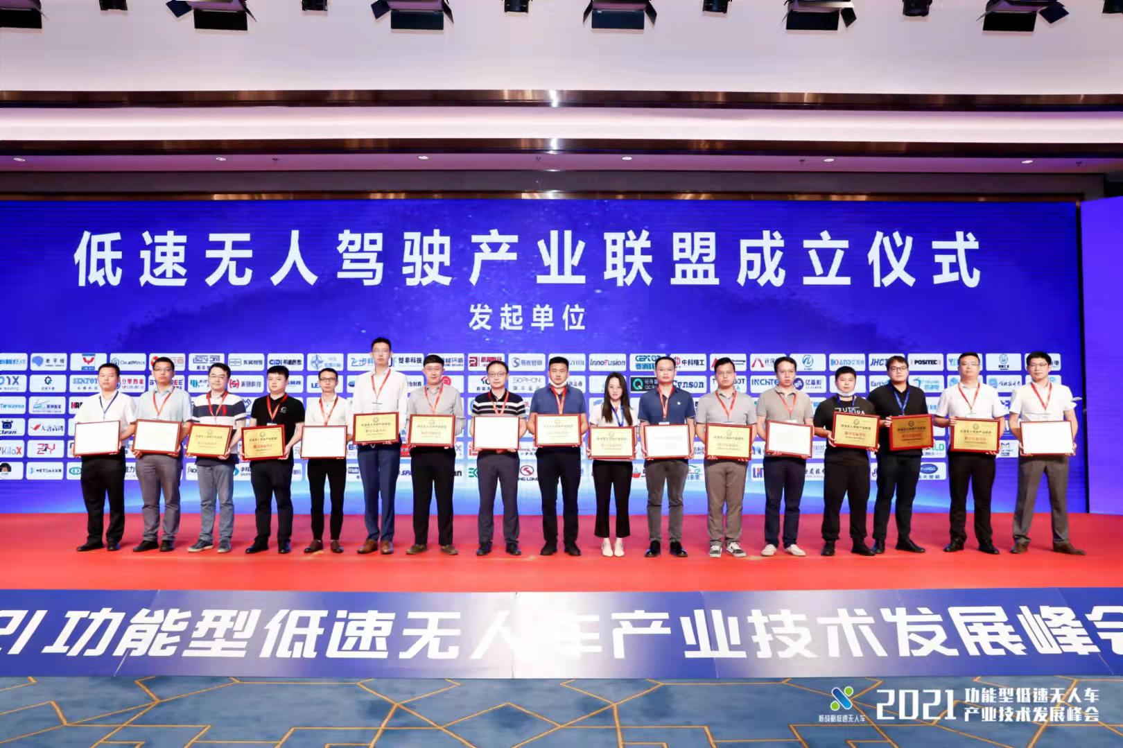 低速無人駕駛產(chǎn)業(yè)聯(lián)盟成立儀式(左二:沃德檢測營銷中心總監(jiān)孫誠)